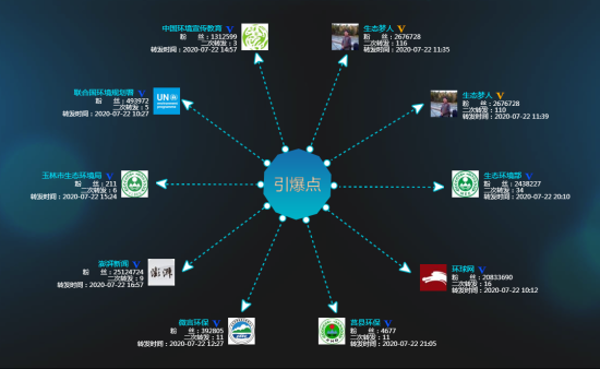 截止7月27日,相關(guān)微博閱讀量達到221.2萬次,轉(zhuǎn)發(fā)240次,點贊49次,短視頻播放量18.9萬次,相關(guān)微博話題 #綠色制冷,清涼世界# 閱讀量達到421.7萬次,討論597次。吸引了多個政府機構(gòu)、媒體、名人等微博大V賬號轉(zhuǎn)載(圖2),包括 @生態(tài)環(huán)境部、@聯(lián)合國環(huán)境規(guī)劃署、@環(huán)球網(wǎng)、@澎湃新聞、@生態(tài)夢人(山東環(huán)保基金會秘書長、部宣教中心環(huán)境公眾參與研究員王必斗)、@巴松狼王(中華環(huán)保聯(lián)合會副主席、生態(tài)環(huán)境部世界環(huán)境日特邀觀察員杜少中)等。在經(jīng)過多級傳播后,信息傳播效果進一步擴大,形成了多個影響力較強的節(jié)點相互呼應(yīng)的傳播局面,進一步擴展了信息傳播的廣度和深度,取得了良好傳播效果。