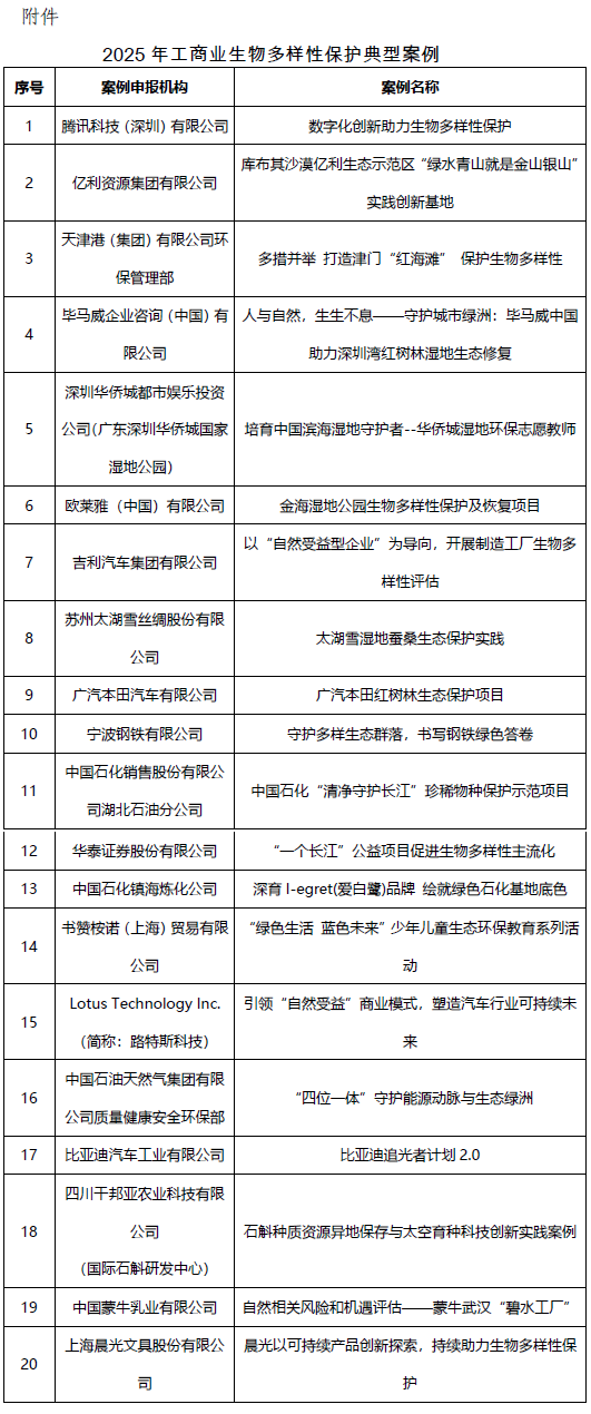 關于2025年工商業(yè)生物多樣性保護典型案例征集活動評選結果的公示