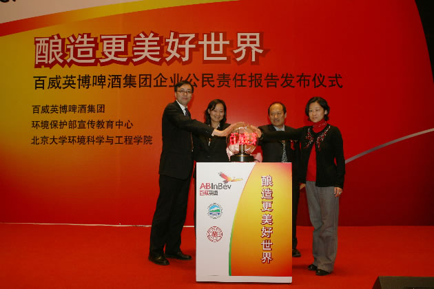 (2008年12月10日,北京)——今天, 全球領(lǐng)先的啤酒釀造商---百威英博啤酒集團發(fā)布了其2008年《全球企業(yè)公民責(zé)任報告》,并向環(huán)境保護部宣傳教育中心、中國企業(yè)社會責(zé)任推廣中心和北京大學(xué)光華管理學(xué)院中國企業(yè)社會責(zé)任研究中心等國內(nèi)環(huán)保和企業(yè)責(zé)任權(quán)威研究機構(gòu)贈送了該報告,并悉心聽取到會專家的點評和建議。這是英博啤酒集團在近期完成對安海斯-布希公司的收購后,首次以新公司——百威英博啤酒集團的名義在中國發(fā)布該報告。