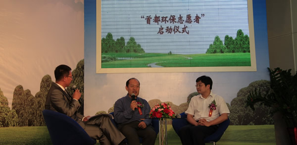 環(huán)保部宣教司副司長賈峰,北京志愿者聯(lián)合會(huì)副秘書長洪亮與主持人做現(xiàn)場互動(dòng)