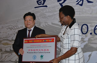 此次獲得FAO批準(zhǔn)為全球重要農(nóng)業(yè)文化遺產(chǎn)(GIAHS)項(xiàng)目試點(diǎn)的是云南省紅河州“哈尼稻作梯田系統(tǒng)”和江西省萬(wàn)年縣“萬(wàn)年稻作文化系統(tǒng)”。至此,我國(guó)共有3個(gè)農(nóng)業(yè)文化遺產(chǎn)系統(tǒng)被批準(zhǔn)為GIAHS試點(diǎn)(第一個(gè)為2005年獲批的浙江青田稻魚(yú)共生系統(tǒng))。MaryJane DelaCruz博士在會(huì)上宣讀了FAO土地與水利司司長(zhǎng)、GIAHS項(xiàng)目總協(xié)調(diào)人Parviz Kohafkan先生給云南紅河州楊福生州長(zhǎng)、江西萬(wàn)年縣程文縣長(zhǎng)的信,Victoria Sekitoleko女士為云南省紅河州的“哈尼稻作梯田系統(tǒng)”、江西省萬(wàn)年縣的“萬(wàn)年稻作文化系統(tǒng)”授牌。