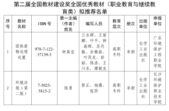 經(jīng)申報(bào)單位推薦、專家評(píng)審,擬推薦《固體廢物處理處置》《環(huán)境法規(guī)(第二版)》等2種教材參加第二屆全國(guó)教材建設(shè)獎(jiǎng)全國(guó)優(yōu)秀教材(職業(yè)教育與繼續(xù)教育類)評(píng)選,推薦名單現(xiàn)予以公示,公示期為2025年7月10日至2025年7月16日。