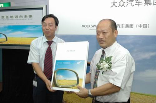 大眾汽車集團(tuán)中國董事會成員、執(zhí)行副總裁張綏新博士向環(huán)保部宣教中心副主任賈峰贈送大眾汽車集團(tuán)2007/2008《可持續(xù)發(fā)展報(bào)告》
