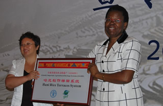 此次獲得FAO批準(zhǔn)為全球重要農(nóng)業(yè)文化遺產(chǎn)(GIAHS)項(xiàng)目試點(diǎn)的是云南省紅河州“哈尼稻作梯田系統(tǒng)”和江西省萬(wàn)年縣“萬(wàn)年稻作文化系統(tǒng)”。至此,我國(guó)共有3個(gè)農(nóng)業(yè)文化遺產(chǎn)系統(tǒng)被批準(zhǔn)為GIAHS試點(diǎn)(第一個(gè)為2005年獲批的浙江青田稻魚(yú)共生系統(tǒng))。MaryJane DelaCruz博士在會(huì)上宣讀了FAO土地與水利司司長(zhǎng)、GIAHS項(xiàng)目總協(xié)調(diào)人Parviz Kohafkan先生給云南紅河州楊福生州長(zhǎng)、江西萬(wàn)年縣程文縣長(zhǎng)的信,Victoria Sekitoleko女士為云南省紅河州的“哈尼稻作梯田系統(tǒng)”、江西省萬(wàn)年縣的“萬(wàn)年稻作文化系統(tǒng)”授牌。