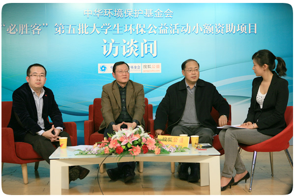 (本刊12月23日訊) 由中華環(huán)保基金會發(fā)起的“‘必勝客’第五批大學(xué)生環(huán)保公益活動小額資助項(xiàng)目”視頻座談會22日在搜狐網(wǎng)絡(luò)大廈的公益頻道直播室召開。中華環(huán)保基金會李偉秘書長(右二)、中國環(huán)境報社李瑞農(nóng)副社長(右三)、中國人民大學(xué)團(tuán)委喬昆副書記(右三)三位嘉賓就大學(xué)生環(huán)保社團(tuán)開展環(huán)保公益活動的優(yōu)勢與不足進(jìn)行了探討,也為到場的大學(xué)生提出的在社團(tuán)活動過程中遇到的問題進(jìn)行了現(xiàn)場解答。中華環(huán)保基金會秘書長李偉還對小額資助項(xiàng)目的開展情況做了詳細(xì)的介紹。